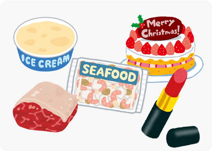 冷凍:−18℃以下の安定した環境で、冷凍食品・肉・アイス・ケーキ、化粧品や医薬品など幅広い商品を保管。