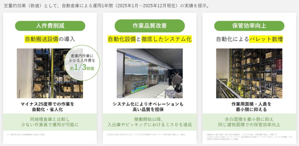 また、冷凍冷蔵物流の現場では、限られた設備や人員の中で、いかに効率的に物流を回すかが常に問われています。当社グループでは、倉庫を点ではなくネットワークとして捉え、現場の選択肢を広げていくべく取り組んでまいりました。具体的には倉庫の共有化とデジタル化を両立させることで、複数拠点・複数倉庫を横断的に活用できるサービスとして提供している点が特長です。加えて、現場運用における徹底した自動化による省人化を進めることで、物流業界が直面する労働力不足への対応や環境負荷の低減にも貢献してきた点が、実装面で評価されたものと受け止めています。今後も当社は、保管領域にとどまらず、輸配送領域への展開も視野に入れながら、持続可能な物流インフラの実現を目指してまいります。