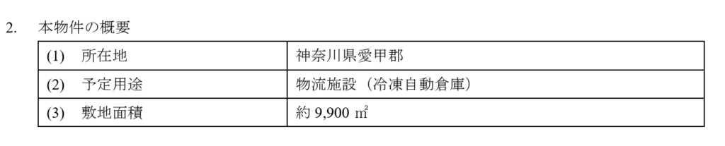 当社は、2030 年のフロン規制に向けた冷凍冷蔵倉庫の設備投資、冷凍食品の消費増加による冷凍冷蔵倉庫の需要拡大、および2024年問題に起因する労働力不足、就業者の高齢化等の物流業界の課題に対応すべく、冷凍冷蔵倉庫および冷凍自動倉庫の開発をおこなっております。このたび、当社の物流施設ブランド『LOGI FLAG』の開発用地を、新たに販売用不動産として取得いたしました。